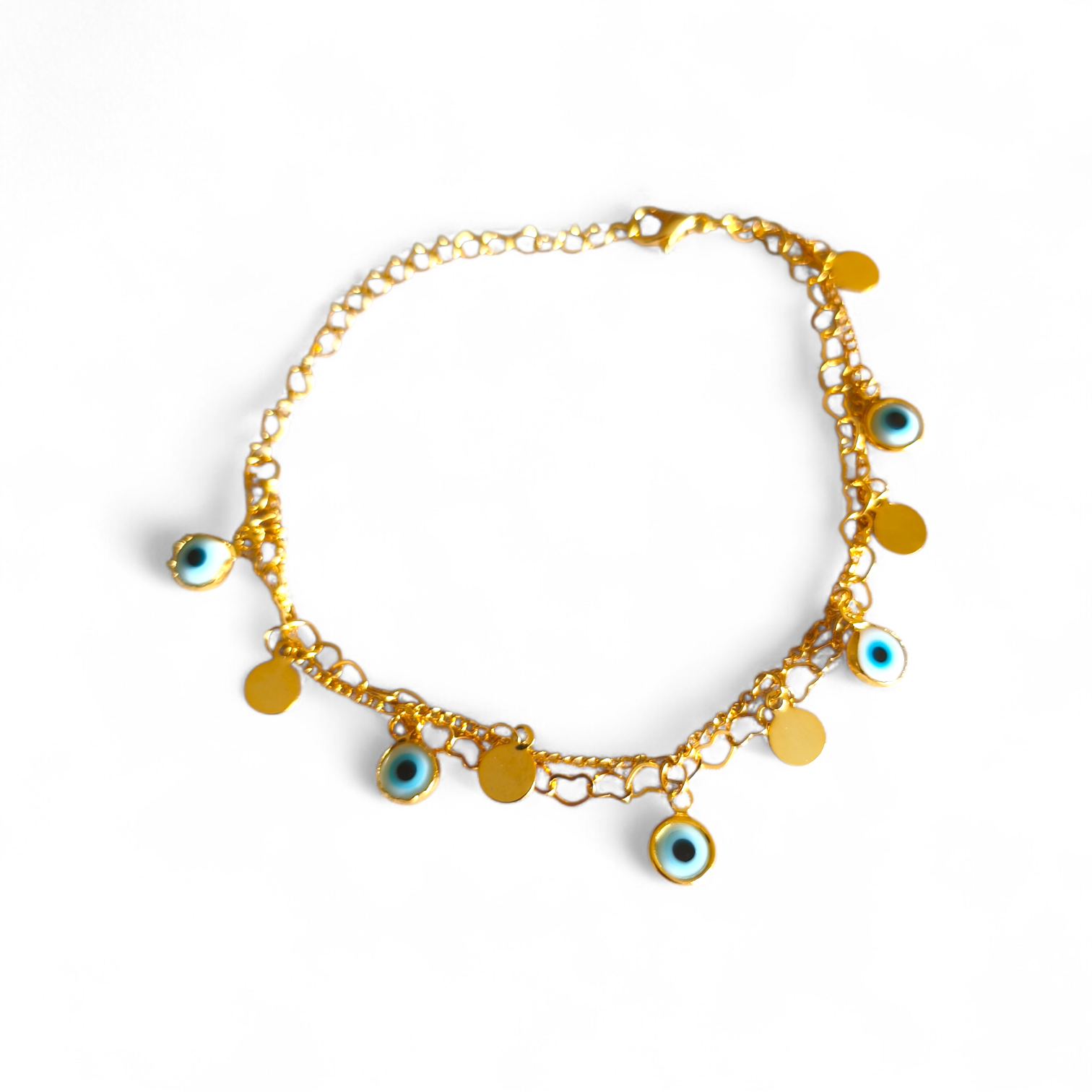 A corrente de fora com pingentes delicados de olho grego e a corrente de dentro feita toda em pequenos corações com pingente de círculo.